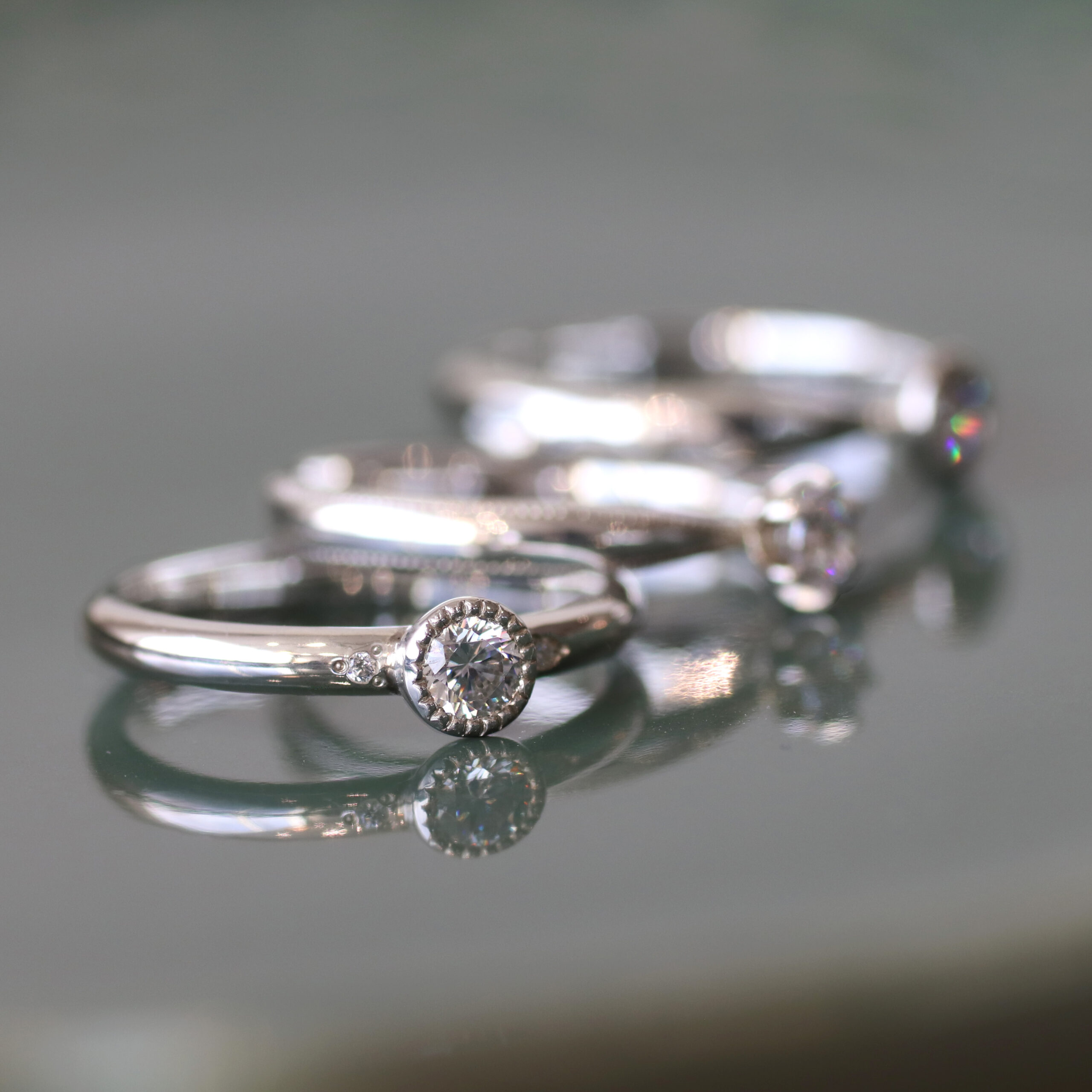 ソリティア(1粒の宝石)やミルグレインなどの定番デザインは、フォーマルな場でもカジュアルな服装でもバランスよく映え、長く愛用できるのが魅力です。