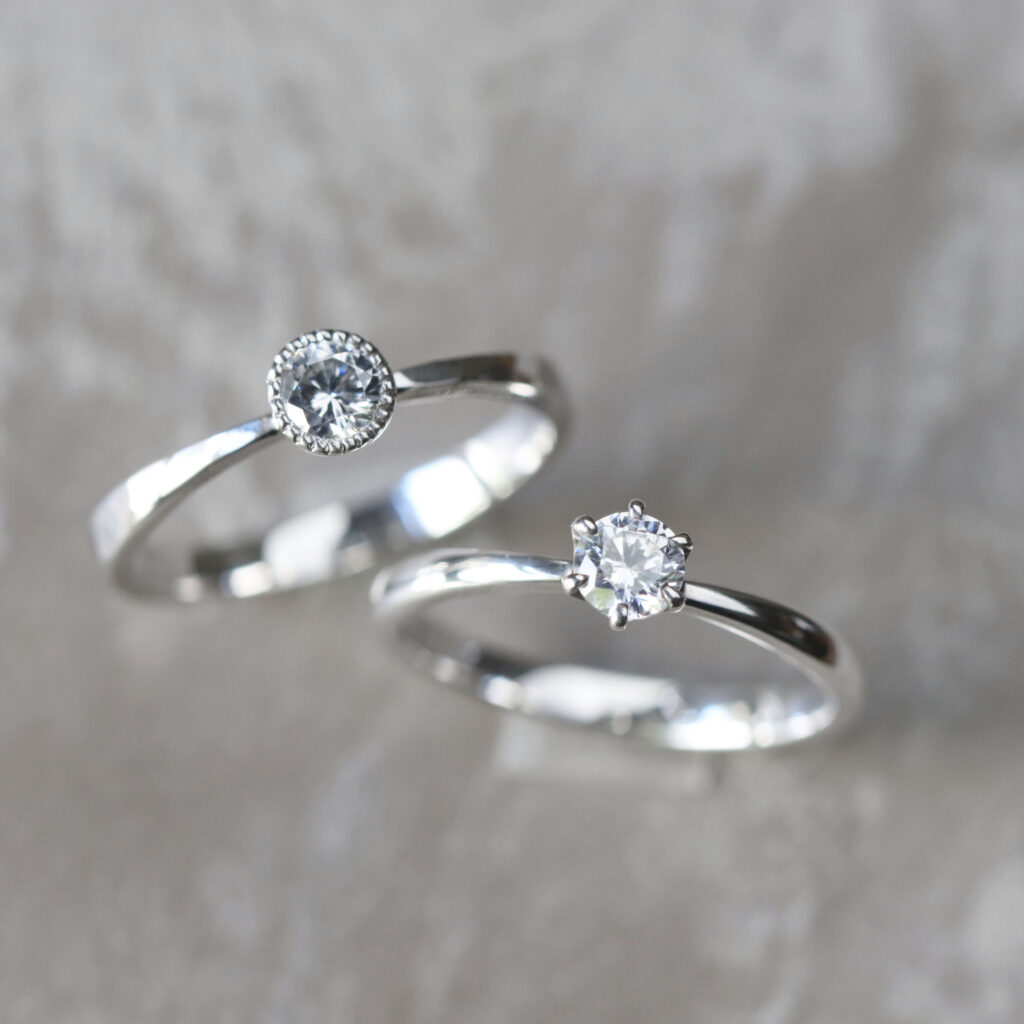 ソリティア(1粒の宝石)やミルグレインなどの定番デザインは、フォーマルな場でもカジュアルな服装でもバランスよく映え、長く愛用できるのが魅力です。