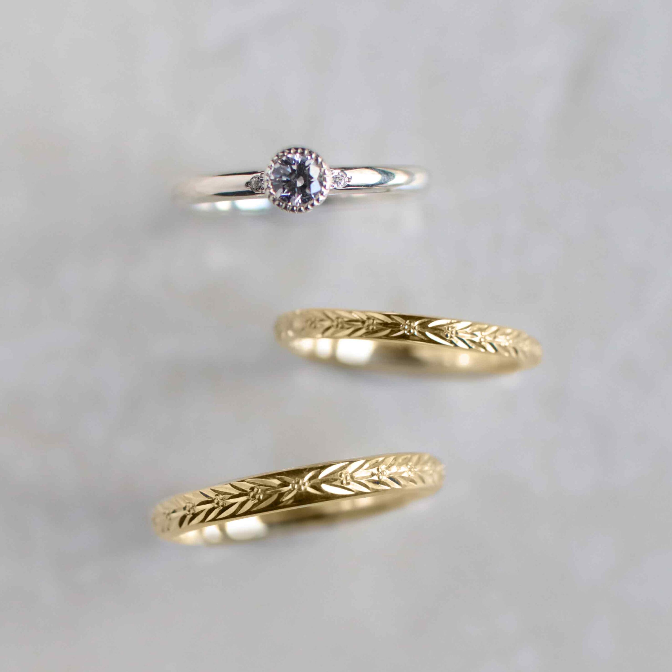 ペアの結婚指輪と婚約指輪をお得に手作りするコース。1本でつけても、重ねてつけても、ご夫婦のペアとしても調和のとれたデザインで、特別なシーンから普段使いまで楽しめます。