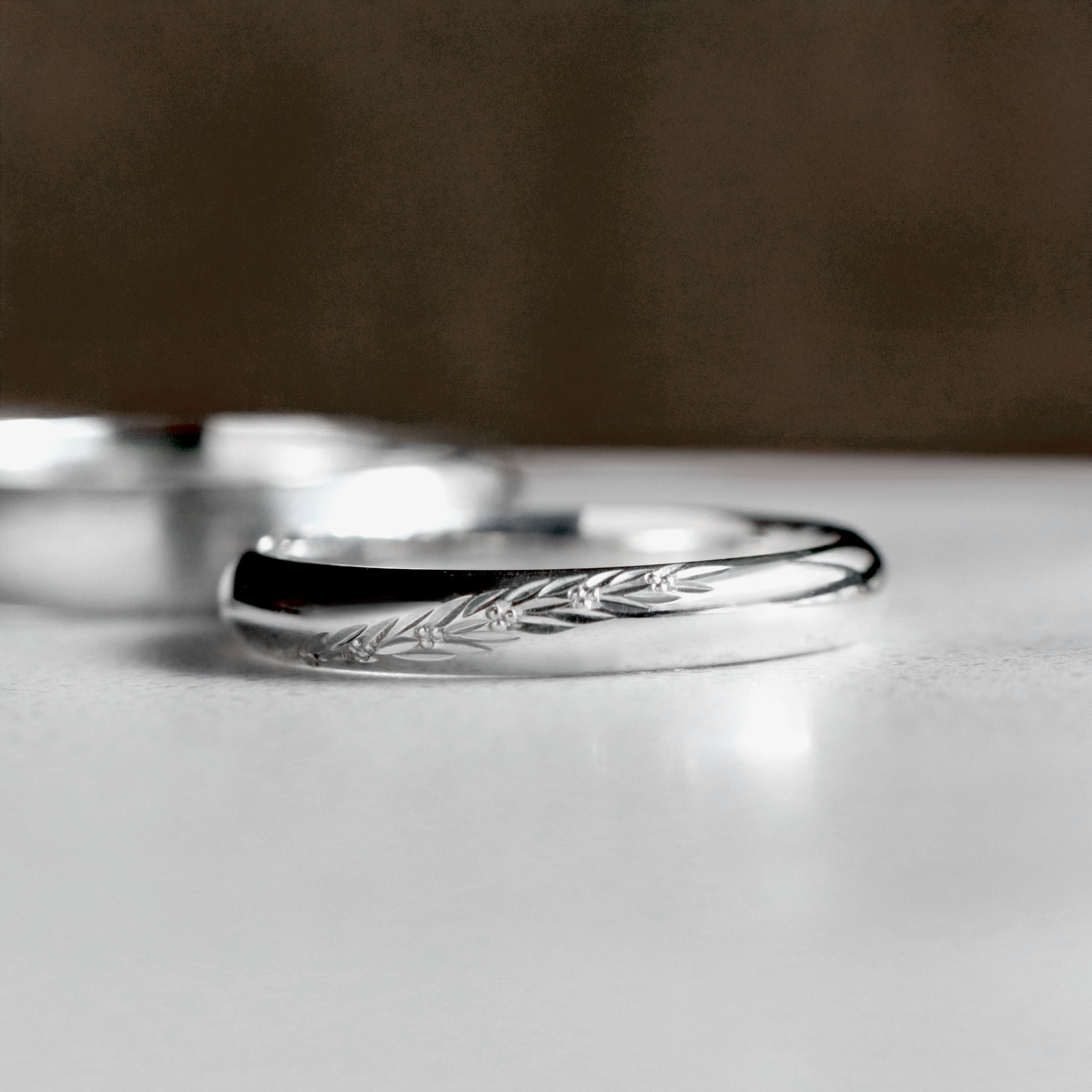 シンプルな甲丸にボタニカルなアクセントの彫り模様を入れた結婚指輪