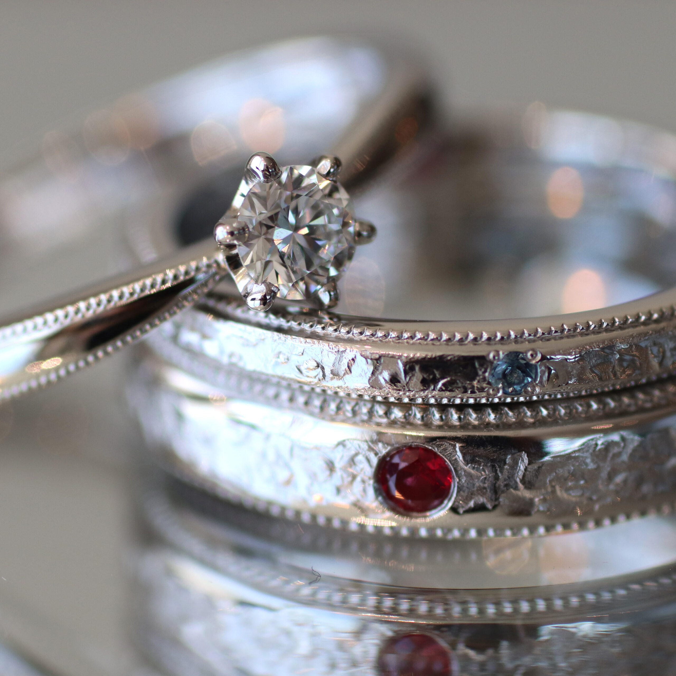 ペアの結婚指輪と婚約指輪をお得に手作りするコース。1本でつけても、重ねてつけても、ご夫婦のペアとしても調和のとれたデザインで、特別なシーンから普段使いまで楽しめます。