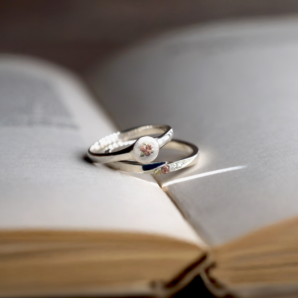 細いリングにも象嵌の意匠を美しく施せるため、軽やかで日常に寄り添うジュエリーに仕立てることができます。