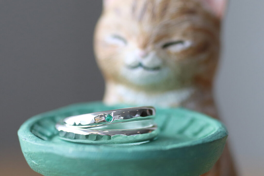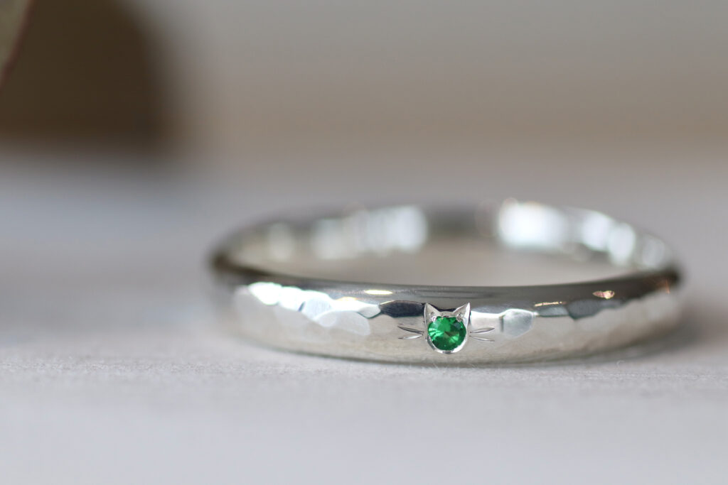鎚目模様をつけていただいたシルバーペアリングの1本にねこ留めを施しました。
