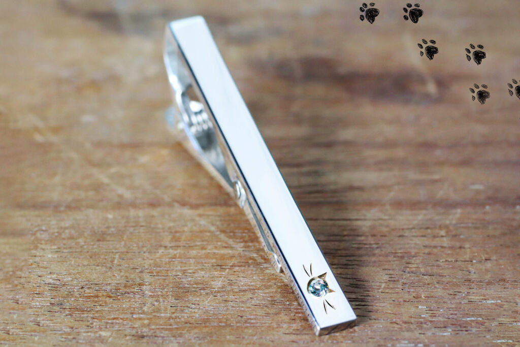 すっきりとしたシンプルなネクタイピンにねこ留めを追加し可愛さをプラスしました。