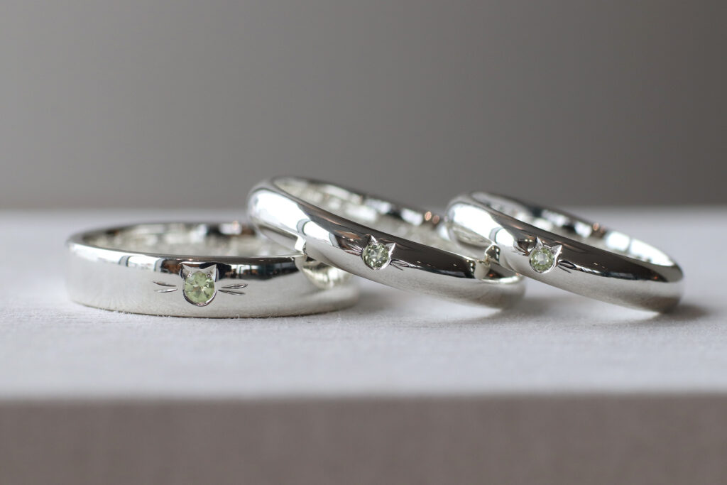 お父様は平打型、お母様とお子様は甲丸型の指輪をご制作いただき、それぞれに1石ずつねこ留めを施しおそろいのファミリーリングに。