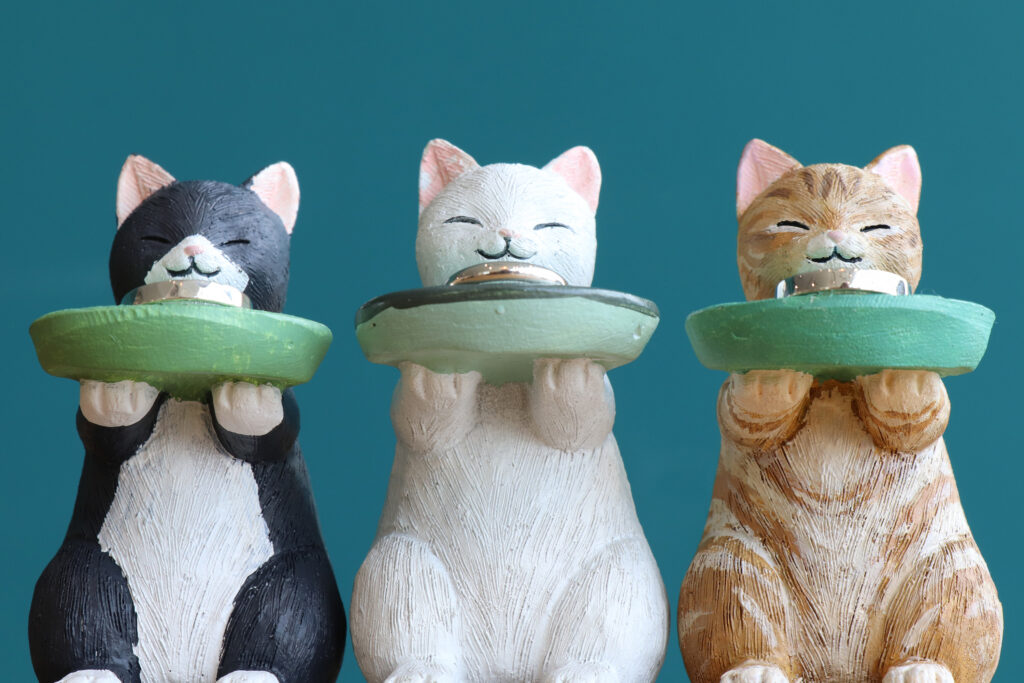 最初は全て真ん中の白猫ちゃんでしたが、工房のスタッフが模様を描いて3種類の個性豊かな3種類の猫ちゃんになりました。
